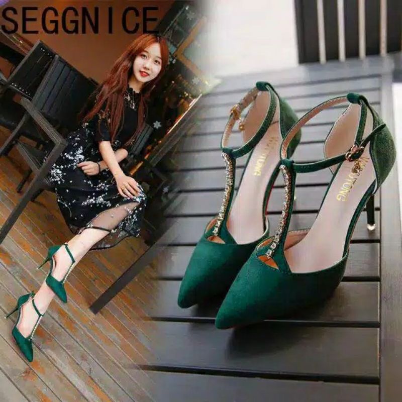 Heels wanita warna hijau warna hitam - sandal wanita korea - heels wanita hak lancip Pd334