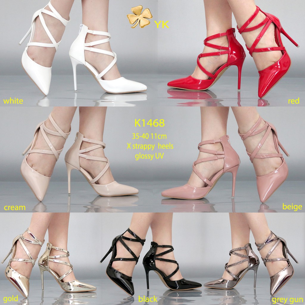 YKshoes 1468 heels 11cm sepatu hak tali silang strappy glossy black red beige white gold grey cream