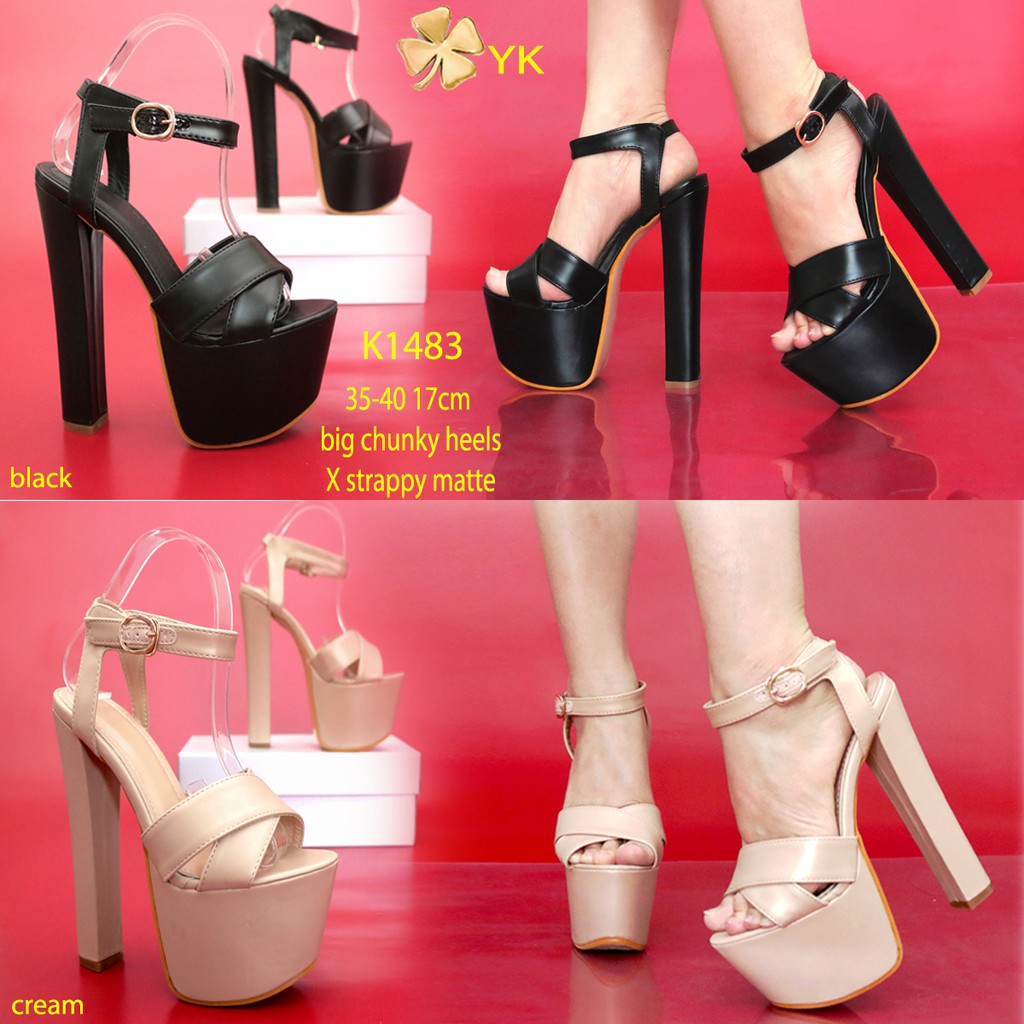 YKshoes 1483 heels 17cm big chunky strappy tali silang tinggi black cream import square kotak hitam